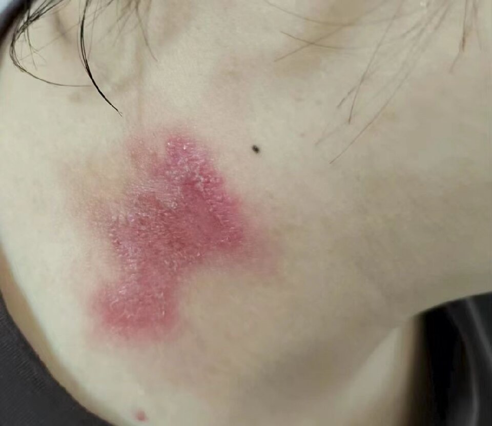 隐翅虫皮炎临床表现多样,发作时常伴有疼痛,临床上有时候会误诊为“带状疱疹”,夏秋季节早晨起床后会在暴露部位发现皮损,皮损形态呈条索状、点片状、仿佛“指甲刮伤”或“墨水迹”,为诊断此病关键线索。