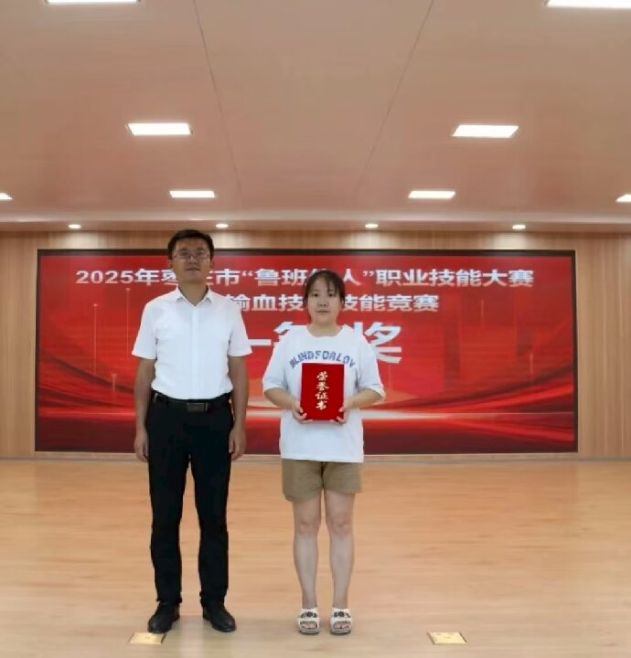 近日,在枣庄市卫生健康委员会、枣庄市人力资源和社会保障局联合举办的2025年枣庄市“鲁班传人”职业技能大赛-输血技术技能竞赛中,我院输血科杨娜表现优异,荣获一等奖。